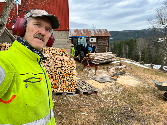 Etter åpningen på Rema1000-butikken dro vi til Soknedal igjen. Jeg holder på med vedarbeid. I år er det lite snø og jeg kan kjøre ned veden med New Holland'en.