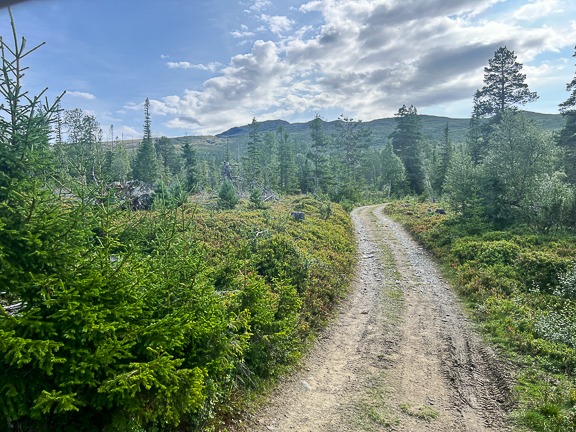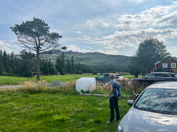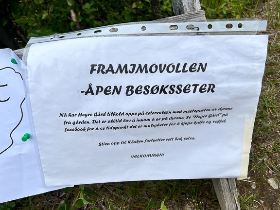 Vi gikk gjennom gården og tok inn på seterveien på andre siden. Det var skiltet til flere turmål herfra.