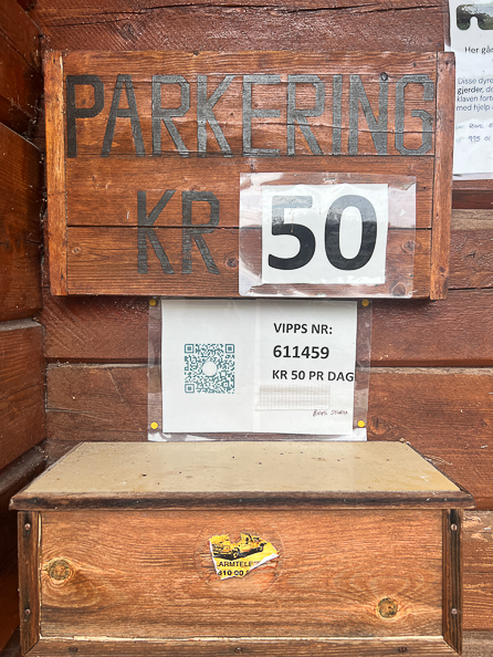 Her parkerte vi på jordet ved den innerste gården. Vipps gjør det lett å ta godt betalt for parkering.