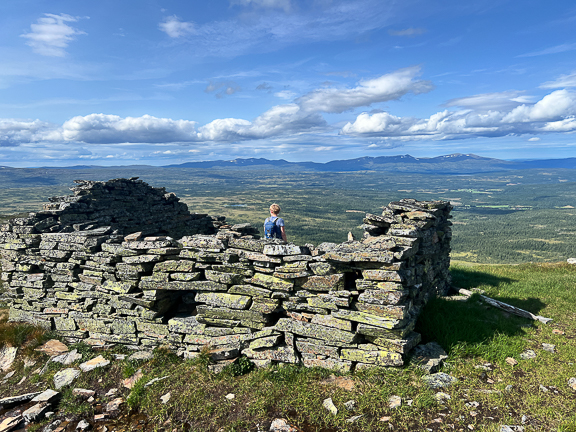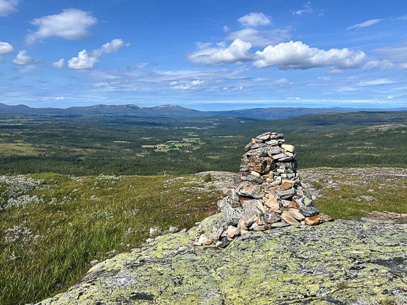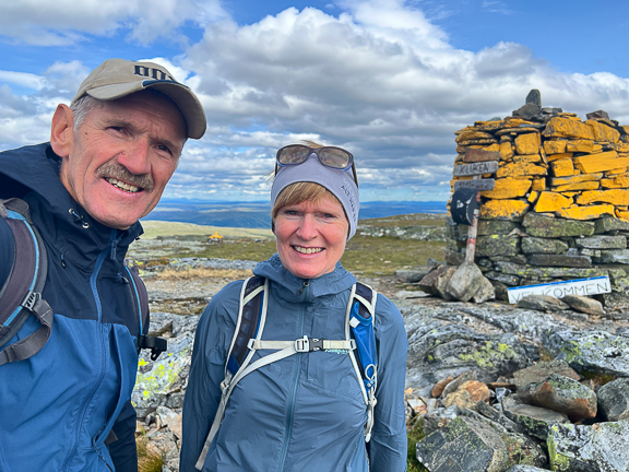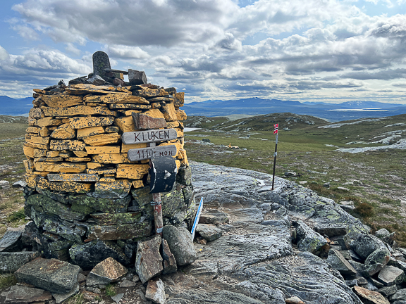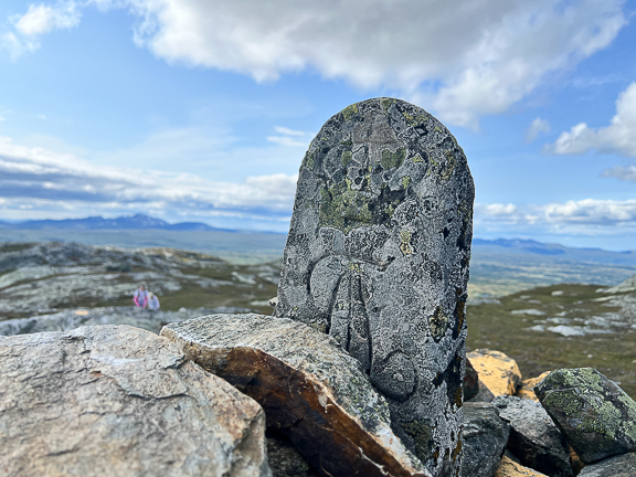 Så er vi på toppen på Storkluken 1110 moh og ved grensen til Sverige. Her står nemlig grenserøys nr 159. Det er 642 grenserøyser langs grensen mot Sverige.