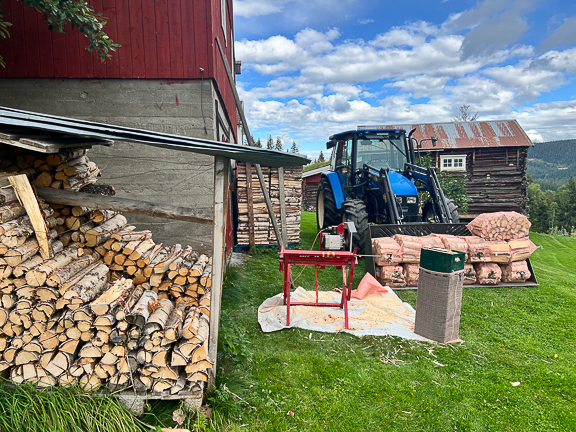 På tide å komme i gang med vedarbeid igjen. Nå er veden tørr og det er bare å kappe og pakke i sekker.