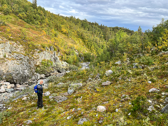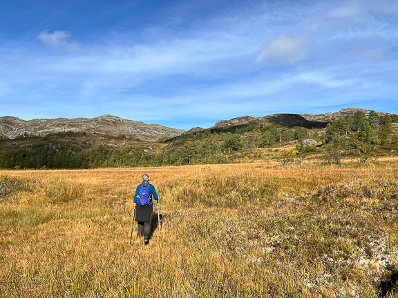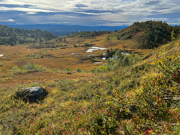 Straks nede. Solveig fortalte at når hun var jente kjørte faren innover hit med traktor og da gikk de opp dette berget.