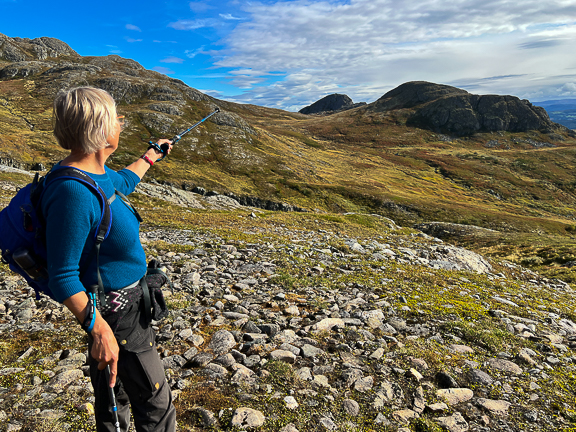 Solveig er godt kjent her. Her peker hun på Håkkåfjellet.