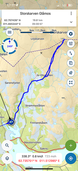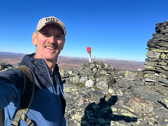 Her er jeg på toppen av Storskarven. Den er på 1265 moh og det er grensefjell mellom Røros og Holtålen. Jeg kom jo litt sent av gårde så jeg ville gå på litt oppover. Jeg brukte 2 timer og 10 minutt opp fra bommen (9,8 km).