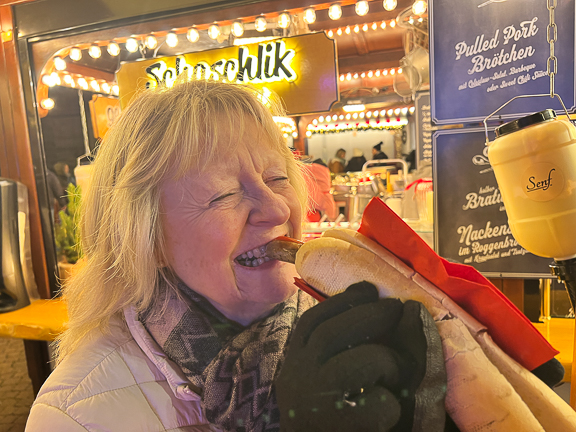 Aslaug prøver seg på en "Wurst im Brötchen".
