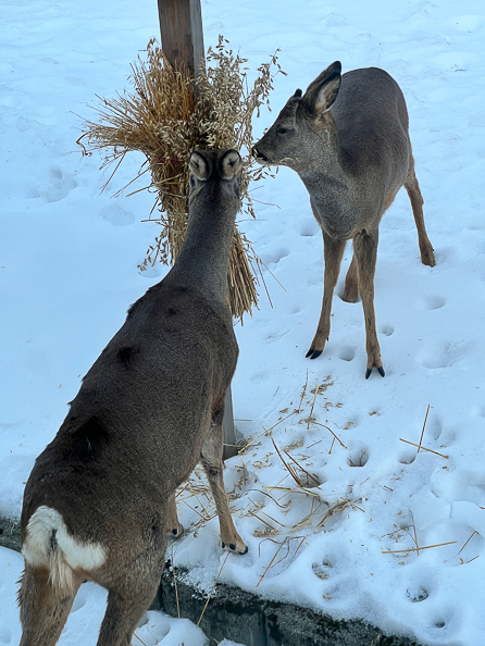 Det er en sjelden kald januarmåned og rådyrene i hagen setter stor pris på kornbanda.